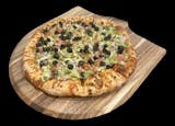 Grilled chicken breast, tomatoes, green olives, roasted red peppers, artichoke hearts, cheddar, provolone, mozzarella cheese & white sauce.